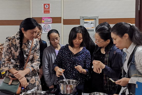 講課結束后,進入膏方現場熬制和體驗環節。本次膏方體驗活動的主角“二冬膏”,是一種傳統膏方,出自明朝洪基《攝生秘剖》,具有養陰潤肺的功效,特別適合秋冬干燥季節服用。二冬膏中僅僅使用了麥冬、天冬兩味中藥,均有清熱滋陰、生津潤燥、潤肺止咳之功,兩藥合用,其功益彰,彰顯中醫配伍理念的獨特魅力。潘高壽的工作人員現場示范如何熬制二冬膏,學員們認真觀看熬制的全過程,積極地問詢,并主動嘗試熬制、試味、分裝?,F場到處是學員們體驗非物質文化遺產的喜悅笑容,到處聽到他們對非物質文化遺產喜愛的聲音。