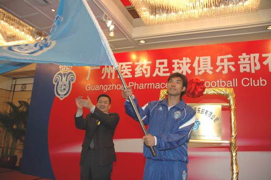 楊榮明董事長(zhǎng)認(rèn)為,廣藥與廣州足球的“聯(lián)姻”可以說(shuō)是醫(yī)藥文化與足球文化的有機(jī)結(jié)合。足球運(yùn)動(dòng)本身與醫(yī)藥的追求始終都是為了健康,強(qiáng)強(qiáng)融合,勢(shì)不可擋。廣藥從經(jīng)營(yíng)角度而言,是實(shí)施品牌戰(zhàn)略需要。廣藥集團(tuán)作為廣州國(guó)企中龍頭企業(yè),經(jīng)濟(jì)實(shí)力雄厚,屬下20多家企業(yè)達(dá)數(shù)百個(gè)產(chǎn)品。去年廣藥集團(tuán)確定了立足廣東,“西進(jìn)、北上、東擴(kuò)”的新戰(zhàn)略。參與足球就是借足球這一全球影響力最大的項(xiàng)目,把廣藥推向全國(guó)以及國(guó)際。“我們注資足球是回饋社會(huì)的一種方式。廣藥這次“涉足”,不是贊助,而是投資——俱樂(lè)部注冊(cè)資金達(dá)2000萬(wàn)元。我們?cè)谥Υ蛟熘袊?guó)制藥業(yè)的艦?zāi)傅耐瑫r(shí),也將全力打造足球這塊城市的名片”楊榮明解開了廣藥集團(tuán)參與足球之迷,顯然是動(dòng)真格的。當(dāng)天,廣藥足球隊(duì)全體將士身穿藍(lán)色(廣藥CI設(shè)計(jì)主色調(diào))隊(duì)服,讓人們眼前一亮,尤其隊(duì)徽,別有新意。“隊(duì)徽?qǐng)D案整體取廣州市木棉花的形狀;花托為一對(duì)羊角,隱喻羊城,花中心為廣藥LOGO,花蕊是皇冠,寓意廣州隊(duì)問(wèn)鼎中國(guó)職業(yè)足球啊。在此,首先祝你們沖超成功”。楊榮明董事長(zhǎng)對(duì)在座的廣州足球運(yùn)動(dòng)將士興致勃勃地解說(shuō)新隊(duì)徽,并給他們打氣。