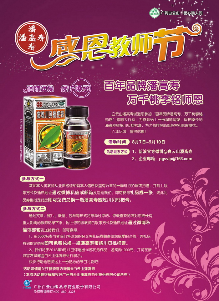 三尺講臺上,常年累月的授課,老師用嗓過度,聲音嘶啞。那代表智慧的粉筆灰在輸送知識的同時,也威脅著老師的肺部健康。 藉此教師節來臨之際,白云山潘高壽誠邀您參加“百年品牌潘高壽,萬千桃李銘師恩”感恩大行動,為恩師送上一份潤肺潤燥,保護嗓子的潘高壽蜜煉川貝枇杷膏,為老師排除肺部危害和咽喉隱憂。百年品牌,值得信賴! 一、活動對象 1、持教育局頒發的教師從業資格證的在職或退休教師; 2、普通消費者。 二、活動時間 1、作品征集、教師提供資料時間:8月7日——9月10日 2、贈品兌換時間(禮品券有效期):9月10日——10月10日 3、10部優秀作品獲獎公布時間:9月17日。 三、活動聯系方式 1、新浪官方微博@白云山潘高壽 2、企業郵箱:pgsvip@163.com 四、活動參與方式 【參與方式一】 教師本人將教師從業資格證印有本人信息及蓋有公章的一面進行拍照或掃描,并附上聯系方式及通訊地址通過微博私信或郵箱發送給我們,即可獲得禮品券一張,憑此禮品券到指定藥房即可免費兌換一瓶潘高壽蜜煉川貝枇杷膏。 【參與方式二】 通過文章、照片、漫畫、視頻等形式將感動過您的、您最喜歡的或對您成長有重大影響的教師記錄下來,附上您和該教師的聯系方式及通訊地址通過微博私信或郵箱發送給我們,即可贏得: 1、前5000名參與者我們將以您的名義將禮品券郵寄給您敬愛的老師,憑禮品券到指定藥房即可免費兌換一瓶潘高壽蜜煉川貝枇杷膏。 2、我們將于2012年9月17日評選出10部優秀作品,各獎勵1000元,并將在新浪官方微博@白云山潘高壽進行展示。 五、作品要求 1、作品必須在活動規定時間予以提交(8月7日——9月10日); 2、作品必須附上作者及該教師的聯系方式及通訊地址(姓名、聯系電話、通訊地址,當地郵編); 3、作品內容須健康向上,不得以揭露他人隱私為目的,不得含有任何不合法信息,否則一律視為不合格作品。 六、禮品送達及獲獎信息發布方式 1、對于可獲得禮品券的前5000名教師,我們會以信件的方式把相關獲獎憑證郵寄到其通訊地址;同時,我們將以短信或郵件的方式通知作品原作者,以方便其及時知曉活動進展情況。 2、9月11日后,我們將在所有合格作品中公平公正地評選出10部優秀代表作,并于9月17日公布獲獎名單,同時在企業官方微博@白云山潘高壽 進行作品展示!屆時,我們會及時聯系獲獎者,給予每位獲獎者1000元獎金! 快快行動給恩師送上一份貼心的節日禮物吧! 活動咨詢電話:400-880-3328 活動詳情請關注新浪官方微博@白云山潘高壽 (本次活動最終解釋權歸廣州白云山潘高壽藥業股份有限公司所有)